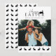 A modern minimalist Easter photo card design by Destei with a chic black and white design. At the top, the greeting features “Happy Easter” in elegant typography with a resting bunny silhouette perched over the letters E and R for a subtle festive touch. Below, a personalizable area lets you add your family name and year, followed by a single photo slot to showcase your favorite memory.