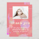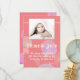 Tarjeta de agradecimiento moderna y linda con foto para niños. La tarjeta tiene un mensaje de agradecimiento para tus invitados, el nombre de tu hijo y la foto del niño - inserta tu foto en la plantilla. Personaliza la tarjeta con tu nombre y también puedes cambiar el texto de agradecimiento y escribir el tuyo. El texto está en un color blanco moderno y trendy. El diseño tiene burbujas suaves en un fondo rosa. Esta tarjeta es ideal para una niña y un niño.