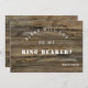 Tarjeta de propuesta para portador del anillo moderna y rústica con fondo de tablones de madera y tipografía de bloque moderna. Posibilidad de cambiar todas las secciones de texto según tus necesidades.