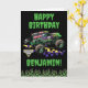 Lleva la emoción de alta energía de Monster Jam a la celebración con este diseño de tarjeta de cumpleaños audaz que presenta el legendario camión monstruo Grave Digger. Contra un dramático fondo negro, el icónico camión salta a través del centro del diseño con sus gráficos de cráneo característicos, llamas verdes brillantes y enormes neumáticos monstruosos. Debajo del camión, un patrón de carreras a cuadros púrpura y amarillo agrega movimiento y velocidad, creando la emocionante sensación de una arena de Monster Jam.