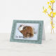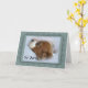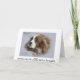 Un cachorro Cavalier del rey Charles Spaniel descansa la cabeza sobre una almohada azul pálido. La cara triste de su ojo dice, lo siento por su pérdida. Personalizar de texto para agregar sus condolencias personales.
