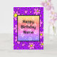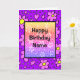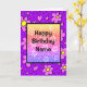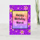 Ilustracion de flores de tipo margarita en tonos morados con corazones y puntos. Personalice fácilmente esta tarjeta editando el texto de la plantilla. En el mensaje principal se lee 'Feliz cumpleaños' y en el interior se lee 'Disfruta tu día especial'. ¡Gracias por ver mis diseños!