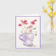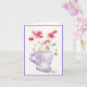A delightful watercolor greeting card showcases a cluster of vibrant poppies arranged inside a charming coffee cup adorned with soft lavender stripes. The poppies, painted in loose, expressive brushstrokes, bloom in warm coral and red tones, their delicate, ruffled petals layered with subtle washes of pink. Slender green stems and airy leaves spill naturally from the cup, adding movement and freshness.