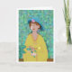 Mujer de arte moderno con un vestido amarillo y un gorra azul sosteniendo flores Dentro del texto dice Feliz cumpleaños, pero este texto puede ser cambiado para adaptarse a tu mensaje