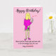Dibujo divertido de una mujer que no se ha cortado el pelo desde el confinamiento, agarrando una botella de vino y una copa para celebrar su cumpleaños. El pie de foto dice 'Feliz cumpleaños' y 'Nombre se puso la vacuna contra el Covid y estaba segura con el conocimiento de que estaba completamente intoxicada (Inoculada ha sido tachada)'. La tarjeta tiene un fondo rosa y la mujer lleva un vestido rosa. Personalice fácilmente esta tarjeta editando el texto de la plantilla. ¡Gracias por ver mis diseños de dibujos!