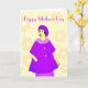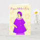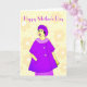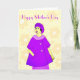 Ilustracion de una mujer con un abrigo morado y boina sobre un fondo de flores sepias.Personalice fácilmente esta tarjeta editando el texto de la plantilla.