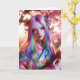 Tarjeta de cumpleaños. Mujer bonito rosa y morada con un efecto místico en un fondo etéreo de flores rosadas y mariposas. Su pelo parece un prisma de bonito.