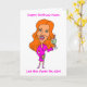 Caricatura divertida y linda de una mujer con el pelo rojo, vestido rosado y botas altas de rodilla rosada sonriendo y sosteniendo un vaso de ginebra brillante y una botella. El texto dice Feliz Nacimiento y Dejemos que el Fiesta se vaya. Personalice fácilmente esta tarjeta personalizado editando el texto de la plantilla.