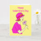 Ilustración de una mujer que lleva un sombrero y vestido rosa y sostiene una flor rosa. El mensaje dice 'Feliz Día de San Valentín'. Edite fácilmente el texto de la plantilla para personalizar esta tarjeta. Gracias por ver mis diseños.