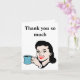 Un dibujo vintage de una mujer sosteniendo una taza de café azul hace una tarjeta de agradecimiento linda y divertida para la hospitalidad de alguien.