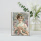 Envíelo como tarjeta de agradecimiento o como fiesta de primavera. Postal de propósito para cualquier ocasión. Este hermoso diseño presenta a una mujer victoriana sosteniendo varias rosas rosas rosas y sus hojas y tallos ligeramente en sus brazos. El fondo es un estilo abstracto de acuarela variada.