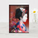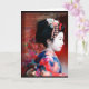 Patrones y texturas sutiles complementan un retrato de una geisha moderna vestida con geisha tradicional.