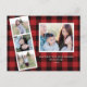 Esta elegante y moderna tarjeta postal navideña cuenta con un fondo rojo y negro de manto búfalo con tres fotos cuadradas y una foto horizontal más grande. Las fotos tienen un aspecto de tira de película o álbum de fotos, lo que le da a toda la carta un ambiente acogedor, de casa de campo. El saludo en la parte delantera dice "LO MÁS FELIZ QUE DESEEN LAS VACACIONES", pero es totalmente editable. Este diseño tiene capacidad para un total de cuatro fotos en la parte delantera de la tarjeta. Al revés, encontrará mucho espacio para escribir su propio mensaje y la dirección del destinatario.