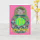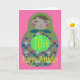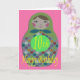 Tarjeta de cumpleaños número 10 con una imagen de una clásica muñeca rusa de forma redondeada con círculos de colores sobre un fondo rosa.