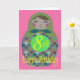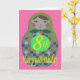 8.ª tarjeta de cumpleaños con una imagen de una muñeca rusa clásica con círculos de colores, sobre un fondo rosado.