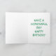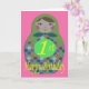 Primera tarjeta de cumpleaños con una imagen de una muñeca rusa clásica con círculos de colores, en un fondo rosado.