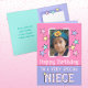 Feliz cumpleaños a una sobrina muy especial. Añadir una foto y un mensaje. Tarjeta de bienvenida rosa, violeta/multicolor con estrellas.