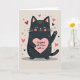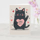 This card shows a round black cat on a soft cream background, looking calm with closed eyes and a small smile. The cat has pink cheeks, a pink nose, and pink inner ears, and it’s holding a big light-pink heart close to its chest ❤️. On the heart, the message “i’d spend all 9 lives with u” appears in simple, lowercase lettering that’s easy to read and centered. Around the cat, small hearts in red and pink float in the air along with tiny crosses and dots, like little love notes scattered around 💌. One paw is lifted as if the cat is waving, and you can see a tiny pink paw pad. The whole design has a light speckled texture that makes it feel cozy and handmade, like something you’d pair with a small treat 🍫.