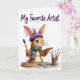 This design shows a long-eared bunny artist 🐰 centered on a white background, pausing mid-paint with a brush raised and a wooden palette in the other hand. The bunny’s soft fur, big brown eyes, and small smile feel like a tender glance shared with someone nearby, as if it’s painting with a friend in mind. It wears a purple beret with a light feather, an orange smock, and a blue scarf with dotted spots that add a cozy, artsy touch. Along the lower area, a pot holds several brushes standing upright, and another palette sits close by with small pools of bright, jewel-like paint. A few scattered paint splashes across the workspace suggest recent activity, like a cheerful studio moment 🌷. Near the top, the phrase “My Favorite Artist” is placed above the bunny in dark lettering that stands out clearly against the white space. The brush tip is coated in fresh color, and the palette shows multiple paint dabs arranged in a loose arc.