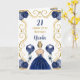 Esta invitación a la tarjeta de cumpleaños incluye un marco dorado elegante, una bella princesa con el pelo rubio y un vestido azul marino, flores y un globo.