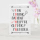 Tarjeta de cumpleaños para papá con palabras descriptivas, incluyendo diversión, cuidado, paciente, útil, inteligente, proveedor, con ciertas letras que deletrean "PADRE" Tarjeta tiene el angustiado fondo de ladrillo blanco y conejo, corazón, flecha y doodles de bombilla. Cambia el verso interior, si quieres.