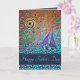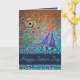 Tarjeta del Día del Padre con plantilla de foto dentro. Un barco navega bajo un cielo metálico. El sol brilla intensamente, resaltando los azules vibrantes del agua. El saludo interior dice: Gracias por ser un padre maravilloso. Estás en mis recuerdos favoritos. Por favor, actualice la plantilla del año actual en la parte posterior. Es fácil cambiar cualquier texto en esta hermosa tarjeta para hacerla suya.