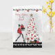 Tarjeta de Navidad moderna para amiga, con una dama elegante vestida de rojo con tacones altos llevando regalos hacia un bonito árbol de Navidad decorado en blanco. Gráficos cortesía de Crave Designs.