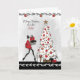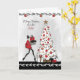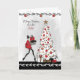Tarjeta moderna de Navidad para una querida hermana, con una dama elegante vestida de rojo con tacones altos llevando regalos hacia un bonito árbol de Navidad blanco decorado. Gráficos cortesía de Crave Designs.