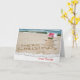 Vacacional snowman de arena con gafas de sol y gorra en una playa con borde roto. El texto es editable.