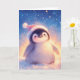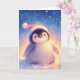 Un pingüino esponjoso se levanta alegremente en la nieve, usando un festivo sombrero de Santa Cruz roja con guarnecido de piel blanca. Los elementos suaves y redondos del pingüino y las mejillas rosadas irradian calor contra el fresco telón de fondo del invierno. Luces ensordecedoras y copos de nieve que caen suavemente crean una atmósfera mágica, iluminando la escena con tonos dorados y azules. Los ojos brillantes y brillantes del pingüino y su sonrisa suave capturan el espíritu de la temporada de vacaciones, lo que convierte a este ilustracion invernal reconfortante.