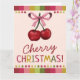 ¡Envíe un poco de alegría con un toque dulce! Esta cédula de postales festiva incluye dos cerezas rojas brillantes atadas con una cinta rosada, acompañadas del alegre saludo "¡Navidades de cereza!" con letras atrevidas y coloridas. Con su fondo rosa claro y sus fronteras a rayas, es una forma alegre de compartir los deseos de las vacaciones que se sienten frescas y divertidas.