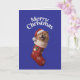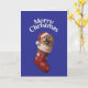Una Chow con un sombrero de Papá Noel se está quedando con un Navidad apilado.