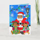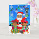 Elfos y Santa, con piel más oscura para representar a las familias afroamericanas. Cuta tarjeta de vacaciones festiva Santa Claus y Elves dibujada a mano que se puede personalizar agregando tus nombres y tu propio mensaje de vacaciones dentro de la tarjeta en el área personalizada.