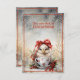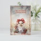 La manera más apropiada de enviar saludos de Navidad a tus amigos y familia. Una linda chica vestida de rojo tomando una taza de té en un fondo dorado y gris de madera. Marco rojo donde se puede cambiar el color