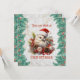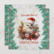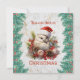 La manera más apropiada de enviar saludos de Navidad a tus amigos y familia. Una linda chica vestida con un sombrero rojo de santa sentada entre bayas huecas, conos de pino y bolas de árbol de Navidad.