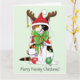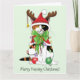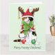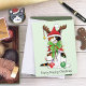 Un gato calico, vestido con Navidades, luces de vacaciones, cánticos rellenos, sombrero de Santa Navidad y una gran reverencia verde sobre un fondo verde claro, ¡El gatito no está contento!