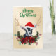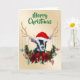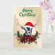 Cabra alpina dulce (mi Annabelle) con su sombrero de Papá Noel y corderos adornados con adornos de rayas navideñas, rodeada por una corona de flores de pino rojo, pinos, vegetación y un gran arco rojo. - arte original ©goatlady GetYerGoat™ -