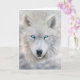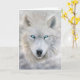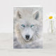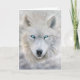 Saludos de temporada para la fiesta de los Navidades con un impresionante lobo blanco enmarcado en una escena nevada y invernal. Sus ojos azules penetrantes destacan maravillosamente contra los suaves tonos mudos.