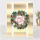 Esta elegante tarjeta de Navidades cuenta con una lujosa corona de Navidades sobre un moderno fondo dorado claro con bandas blancas. La corona está decorada con cañas de pino, azulejos blancos, rojos y azules, estrellas doradas y copos de nieve. Decoración muy feliz con el texto Feliz Navidad y el nombre del remitente al personalizar. Feliz Navidad!