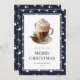 Elegante tarjeta azul de Feliz Navidad con caída de nieve, estrellas y agua caliente bebida de chocolate en un fondo estelar azul oscuro. Personalice fácilmente esta moderna tarjeta de vacaciones de color azul con su nombre familiar.