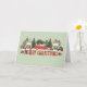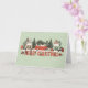 Estilo vintage Tarjeta navideña merry con coches y árboles, y Feliz Navidad en rojos sobre fondo verde rústico claro