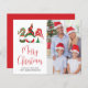 Tarjeta de vacaciones económica con fotos y tres bonitos gnomos nórdicos con gorras de estilo escandinavo rojos y verdes. "Feliz Navidad" está escrito en un guión rojo de moda. Añade tu nombre en una simple tipografía moderna.