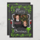 Un fondo de pizarra con hermosos rollos de verde con estrellas rojas y texto blanco que dice "Feliz Navidad" delante y "Que todos tus días sean alegres y brillantes" detrás. Esta hermosa tarjeta personalizada de fotos navideñas de vacaciones tiene varios adornos estelares, y un pájaro en un diseño de nido y áreas que puedes fácilmente agregar tus nombres, el año actual, y foto!