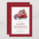 Watercolor Happy Holidays card con un camión retro rojo que lleva un árbol de Navidad y regalos. Personalice fácilmente esta nevada tarjeta de vacaciones con su nombre familiar y el año.