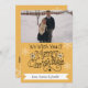 Texto negro que dice "Te deseamos una Feliz Navidad" delante y "¡y un Feliz Año Nuevo!" detrás con un fondo dorado, copos de nieve blancos y ciervo de silueta, y áreas donde puedes agregar tu nombre de familia y foto en una tarjeta de felicitación de vacaciones para Navidades ¡seguro que quieres mandar a familia y amigos!