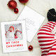 Precio económico Tarjeta plana SMALLER de 4,5" x 5,6" 110 lb para sus saludos festivos en una brillante tarjeta SEMI GLOSS de 110 lb (similar al grosor de una postal) NOTA: El sobre suministrado con esta tarjeta es ligeramente más grande que la propia tarjeta. Tarjeta Feriada de Fotografía Primaria de Navidad. Mi primera Navidad en una moderna tipografía audaz en rojo. Simplemente reemplace la imagen de ejemplo con su propio favorito de formato cuadrado y personalice con su saludo y nombre en la parte inferior y el mensaje en la parte posterior.