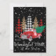 Este diseño presenta un camión rojo vintage con un árbol de Navidad en la parte posterior y árboles de plaid y estampado de animales detrás con nieve que cae. También hay texto en la parte inferior que dice, "Es la época más maravillosa del año"