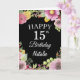 Tarjeta negra de cumpleaños número 15 con flores florales de acuarela con nombre y edad personalizados. Para una personalización adicional, haga clic en el botón "Personalízalo" y use nuestra herramienta de diseño para modificar esta plantilla.