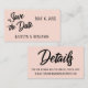 Mantenga a sus invitados de boda al tanto de todos sus planes con estas detalladas tarjetas de inserción de regalos de boda. Estas tarjetas reflejan un estilo elegante y casual. Los textos superpuestos bonitos se diseñaron utilizando una fuente de escritura moderna, audaz y casual en negro. Un lado dice "Guarde la fecha" y el otro simplemente dice "Detalles". Utilice los campos de la plantilla para personalizar estas tarjetas con su información personal. Impresas utilizando "tecnología de tarjeta de presentación", el práctico tamaño será fácil de tener a mano. Envíelas por correo con sus envíos tradicionales y quédese con algunas para compartir con aquellos que necesitan uno o dos extras. El fondo está cubierto con un bonito rosa rubor y este color editable se puede cambiar a cualquier cosa de su paleta de boda que elija; todo el texto editable aparece en un negro complementario. // 89 // Diseñado por Melody Watson para Paper