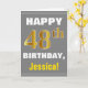 Este sencillo diseño de tarjetas de felicitación con temática de cumpleaños presenta un cálido deseo de cumpleaños como "¡FELIZ CUMPLEAÑOS, Jessica!" en la parte delantera, en negrita con un fondo gris (gris) de color. El número de cumpleaños tiene un aspecto de color falso/imitación dorado. El nombre del frente puede ser personalizado. El interior incluye un mensaje de cumpleaños de personalizable. Una tarjeta de felicitación como esta podría ser una manera divertida de entregar deseos de cumpleaños a alguien que está celebrando su cumpleaños cuarenta y ocho. [~Z0000283]